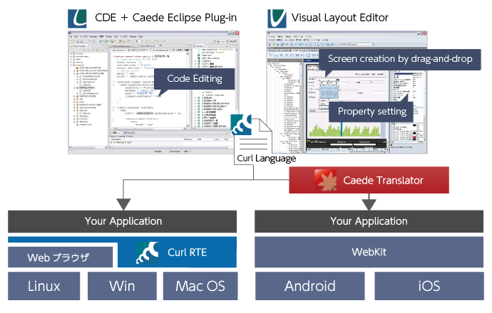 In light of these circumstances and in order to address the proliferation of devices and OSs, SCSK has begun providing the mobile application development environment Caede as an addition to its existing product “Curl Development Tools for Eclipse Ver.8.0.1002”. With the addition of Caede, mobile development can be addressed with a single language (Curl), and, as with the existing PC and RIA platform support, take place in a truly cross-platform development environment.